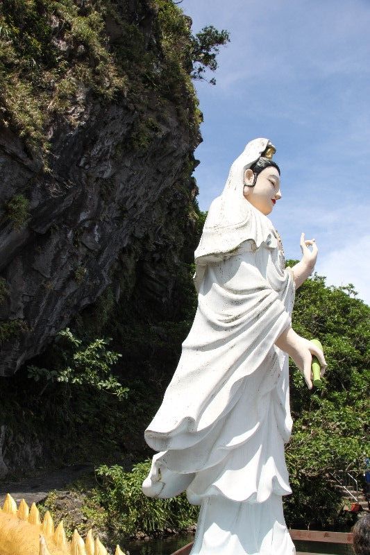 在往前走,便是島上唯一的觀音寺「普陀巖」。相傳當年的駐軍,因為各種意外事件導致人心惶惶,為了安穩軍心,特地從礁溪護送觀音像到烏石港,再渡海來到龜山島。
